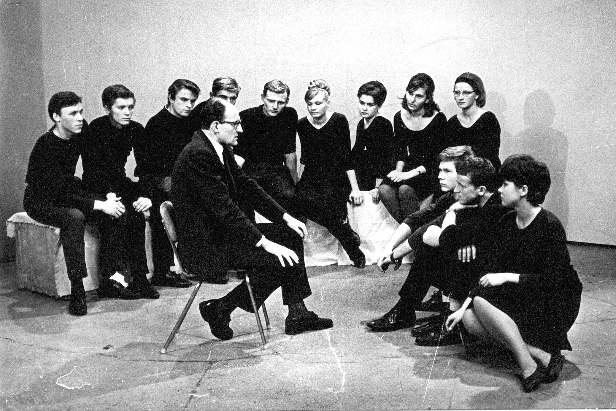 Haralds Ulmanis (pirmais no kreisās puses) un Dailes teātra aktieru 4. studija, un kursa vadītājs Pēteris Pētersons, 1969